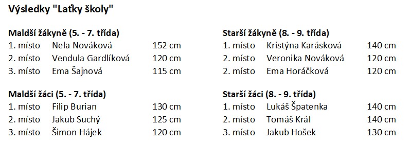 Ve čtvrtek 26. března se uskutečnil tradiční přebor školy ve skoku vysokém „Laťka školy“. Soutěžilo se v kategoriích 5. – 7. třída a 8. – 9. třída. Celkem se zúčastnilo 30 žáků napříč kategoriemi. Bohužel několik favoritů i dobrých skokanů se z různých důvodů nemohlo zúčastnit. Přesto byly závody okořeněny vynikajícím výkonem Nely Novákové, která třikrát překonala letitý rekord školy v kategorii dívek. Jeho nová hodnota je 152 cm. Gratulujeme!
